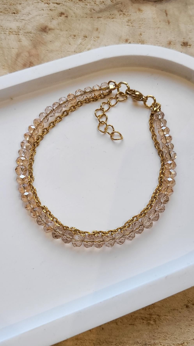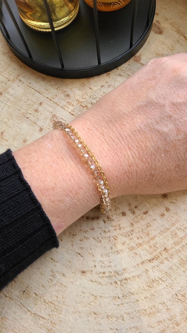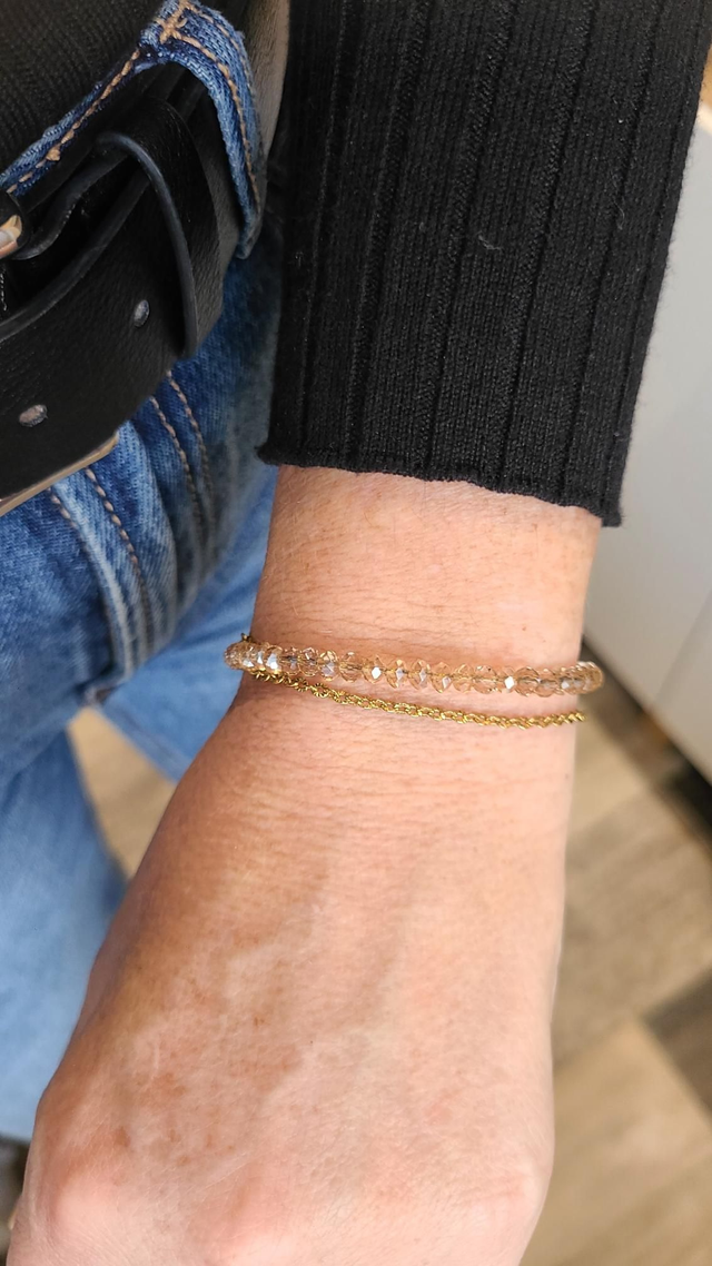 Le bracelet Capri évoque la douceur du soleil sur la peau. Ses perles champagne rosé apportent éclat et féminité, rehaussées par une chaîne dorée en acier inoxydable.