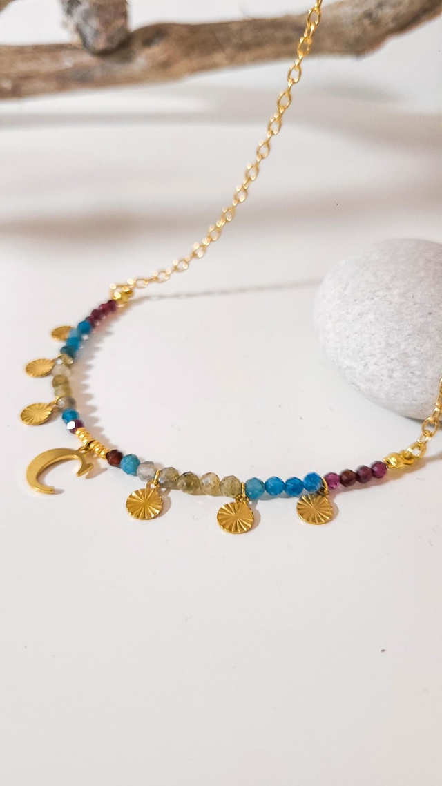 Collier artisanal en pierres naturelles, monté sur chaîne acier inoxydable doré, hypoallergénique.