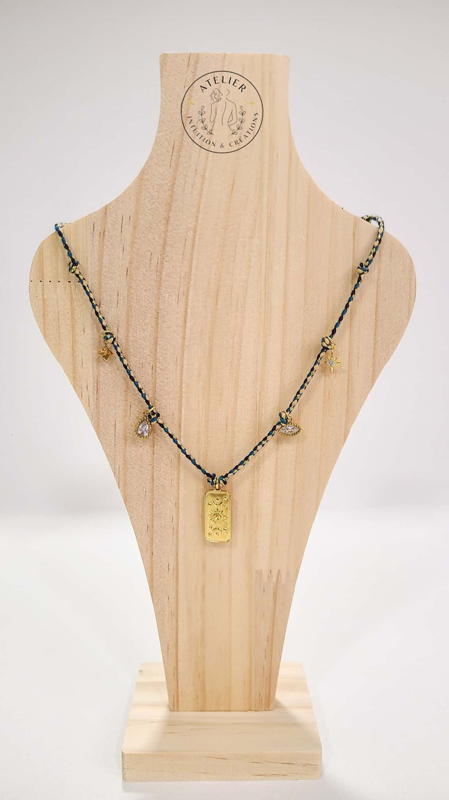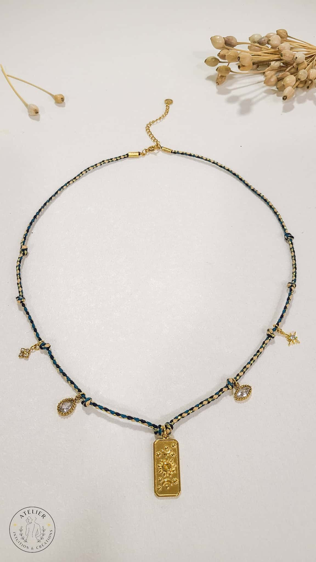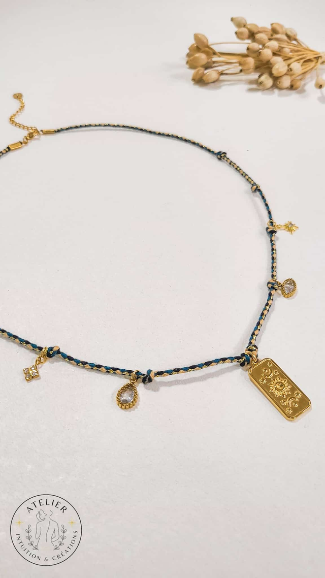 • Matières : Acier inoxydable doré, cordon 3 brins beige/bleu avec fil doré, zircon.