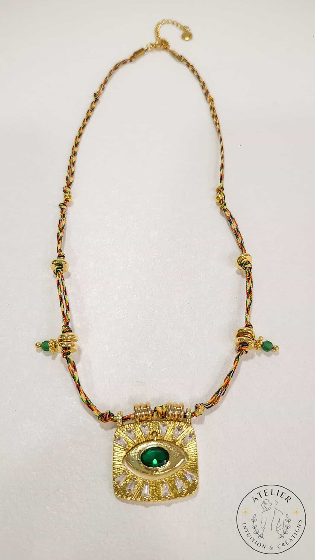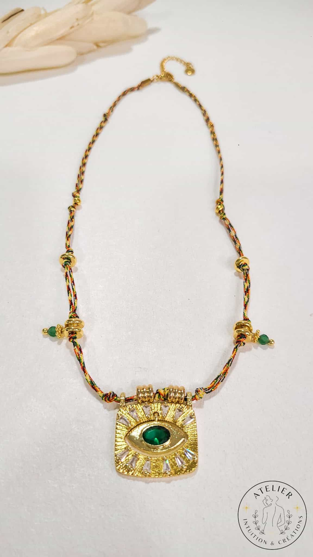 Au centre, l’œil protecteur en acier doré, orné d’un zircon vert mobile, apporte cette touche mystique qui accompagne le quotidien avec intention.