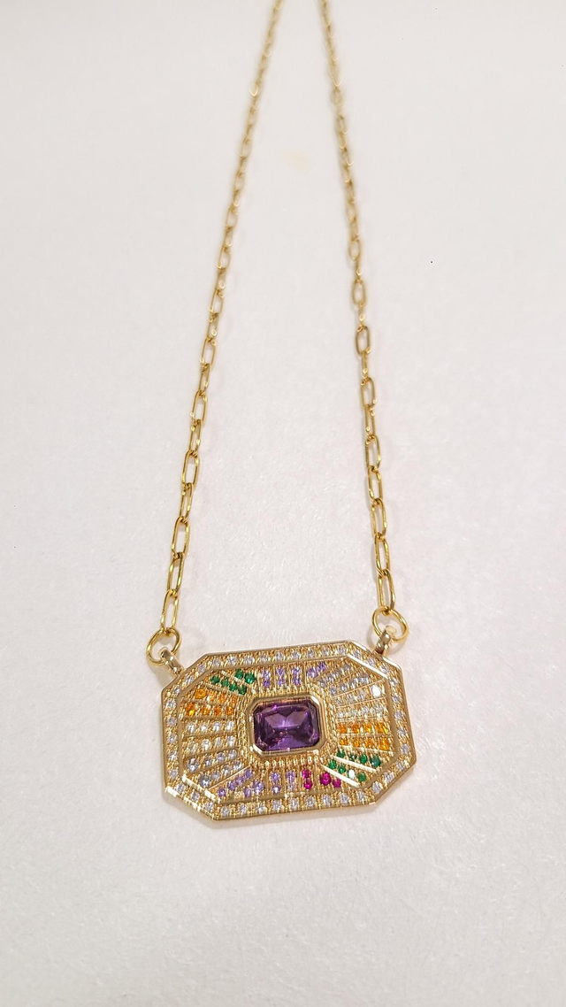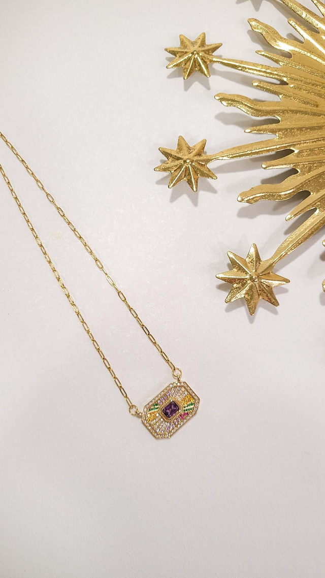 Le collier Zanzibar illumine vos journées d’une subtile touche de couleur et de lumière, monté sur une chaîne à maille fine dorée.
